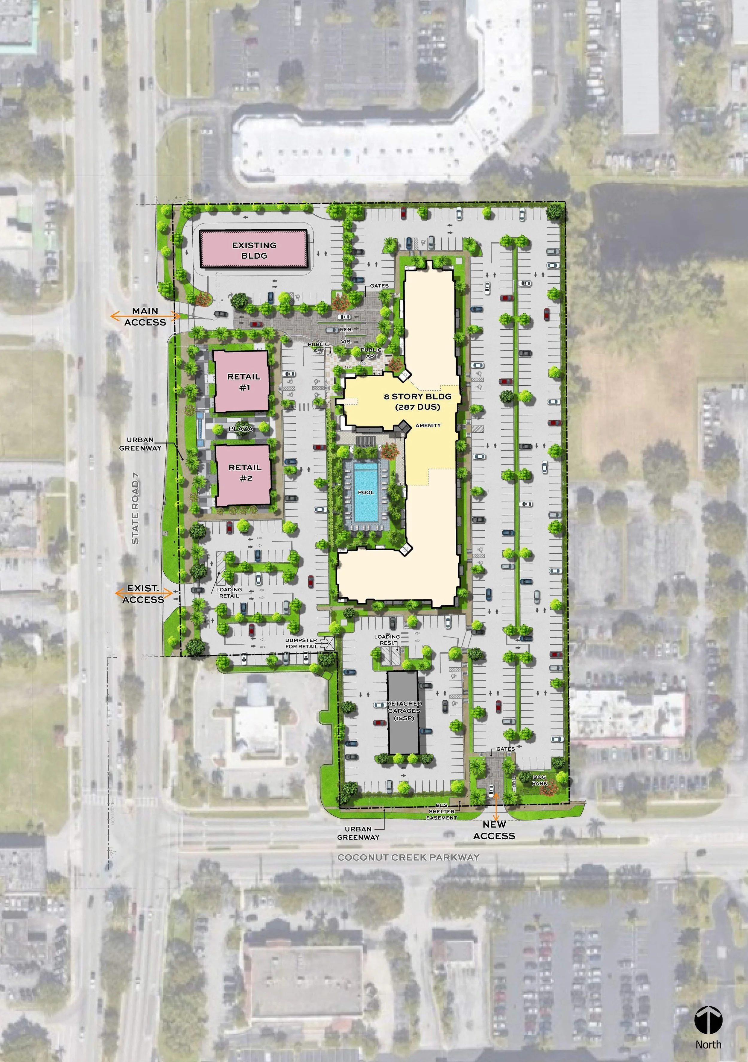 287 units, 8-story, surface parked, amenities include pool courtyard, club room, co-work, fitness, and bike room. Plus, 11,000 sqft of F&B retail with outdoor plaza seating areas